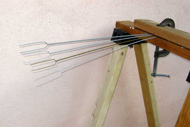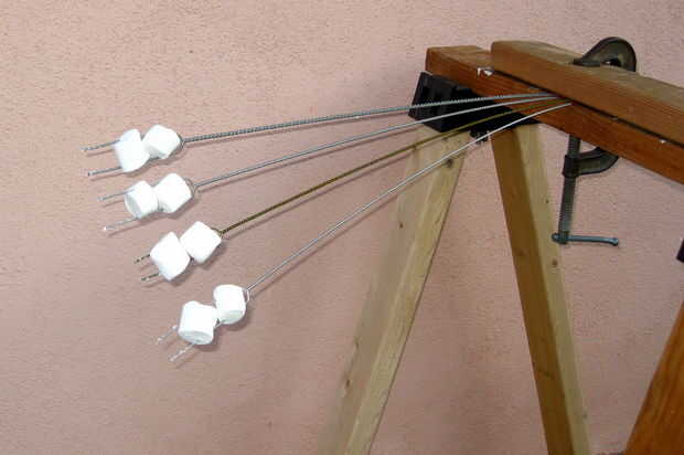 Colgadores de ropa de alambre típico son cualquiera 11 GA o alambre calibre 13. El alambre de calibre más pesado puede parecer preferible pero mi experiencia ha sido que la tasa de rotura mientras que la horquilla de la bobina es muy alta (~ 100%). El gancho de ropa de alambre calibre 13 hace un buen trabajo para asar malvaviscos, sin embargo, no es lo suficientemente rígido como para asar salchichas. Los colgadores de ropa de alambre pueden sustituirse por alambre de acero inoxidable. A continuación es una lista anotada de alambre que he usado.