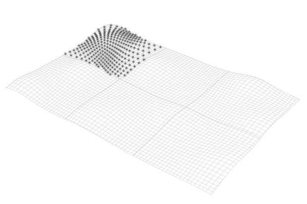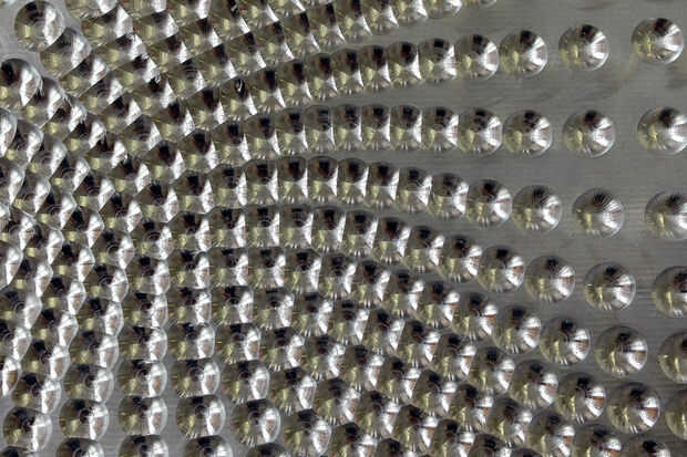 Una serie de puntos (tomado de la superficie general paramétrica) se proyectaron hacia abajo sobre la pieza. Estos puntos proyectados se convirtieron en los puntos centrales para una rutina de perforación. Lamentablemente Inventor HSM no seleccionar automáticamente todos los puntos de perforación (si el procedimiento de perforación no es perpendicular a una superficie - que estos no eran) así que tuve que seleccionar cada punto individualmente para la operación. Una fresa esférica fue utilizada para perforar por debajo de la superficie original por un valor de profundidad especificado. Dependiendo de cómo de cerca espaciados los puntos eran, las intersecciones entre los divots variaban el patrón general de maneras inesperadas.