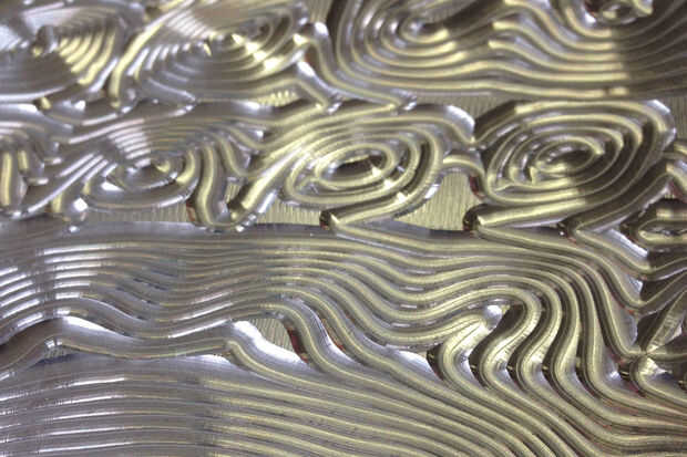 Para esta parte, se aplicó un script utilizado para mallas 'almohada' como el primer paso en el proceso. Los parámetros permitidos para almohadilla más en las zonas 'más profundas' (o con mayor desviación de una línea de base). En lugar de simplemente dejar con un paralelo fino acabado (como fue hecha en una de mis exploraciones anteriores de CNC - GEODE serie) un contorno regularmente espaciado a través de la malla fue tomado y utilizado otra vez para las operaciones de 'tracing' en Inventor HSM. Estos trazos se mecanizan utilizando una fresa de bola pequeña. Porque el 'pillowing' varió entre áreas, el contorno era muy irregular en apariencia y algo inesperado.