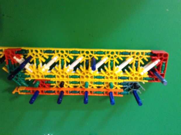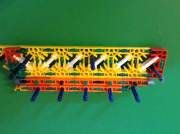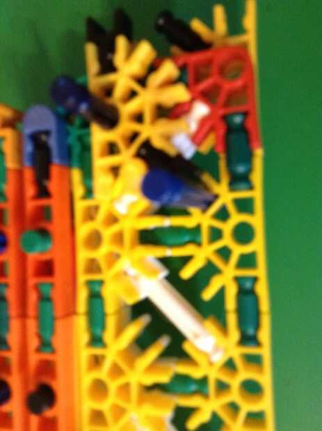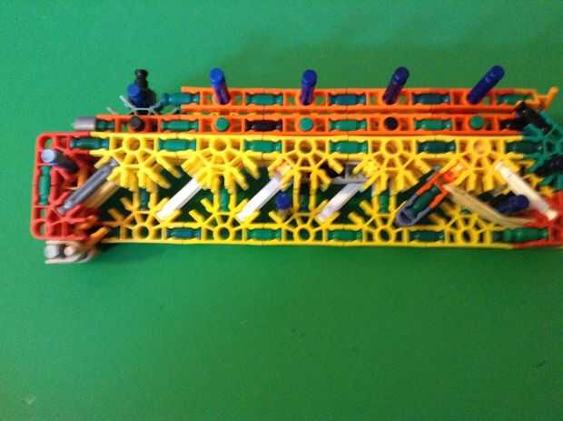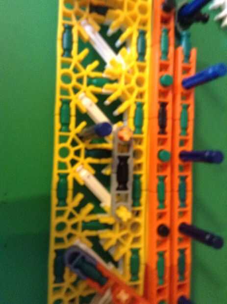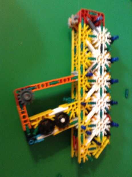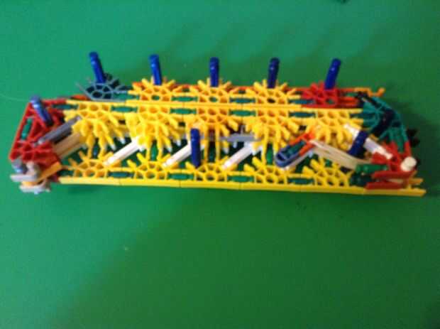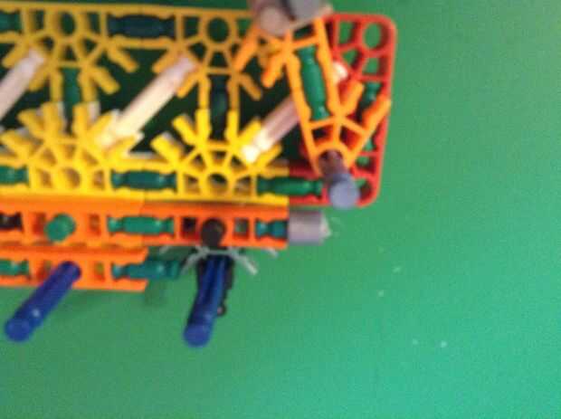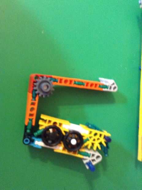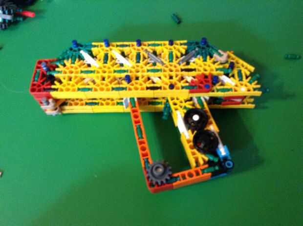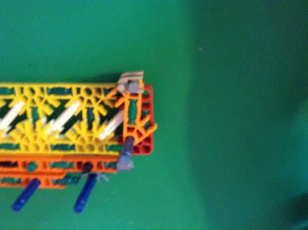 Hi i made this k'nex bulldozer , which has steering and a digging scoop. También tiene unas escaleras ubicadas en la parte trasera del vehículo. El manejo posterior es una gran idea porque ayuda a la topadora manejar mejor que un coche alrededor de l