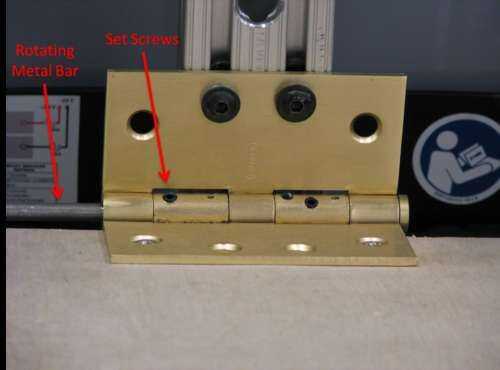 Reemplazar el pasador de la bisagra en los reposapiés con varilla redonda y perforar los tornillos de la bisagra a la barra de bloqueo en su lugar.
