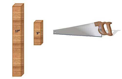 Corta dos listones de madera. Una aproximadamente 17" de longitud y el otro aproximadamente 5" de longitud. Anchura y la profundidad deben ser 1" por 1".
