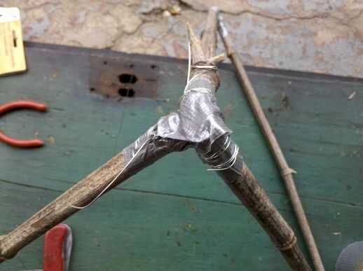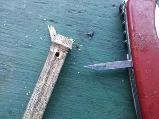 No tienes que hacer esto, pero taladrar orificios para el cable puede hacer la Unión más fuerte. Utilice una pequeña broca o escariador (como en la navaja suiza en la foto) y agujerea un agujero cerca de un nodo en la caña de bambú. Si se intenta perforar el bambú con un punzón, clavo o tornillo, generalmente dividirá--así la necesidad de pretaladrar. Si hilo de alambre por un orificio que no sea cerca de un nodo, puede cortar en la caña del entrenudo apretar el alambre y simplemente dividir la caña como un cuchillo. El nodo proporciona un travesaño en la estructura de caña que evitará salpicaduras de propagación.