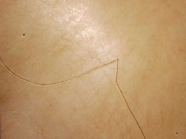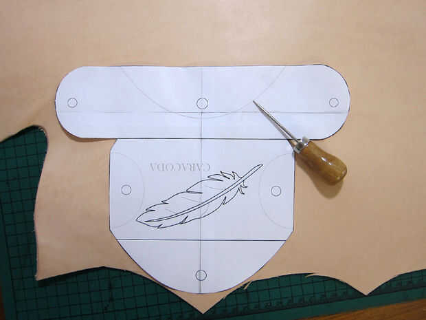 Descargar el archivo PDF con corte y talla de patrones. Cortar hacia fuera y coloque sobre cuero. Use una lezna del rasguño para trazar el patrón en cuero. No hacen rasguños, sólo lo suficientemente profundas como para ver las líneas. Marque las ubicaciones de botones de presión.
