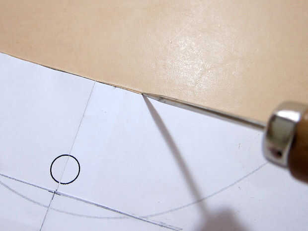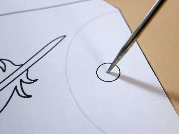Utilice las tijeras o un cuchillo para cortar el patrón fuera del cuero. Uso alrededor de punzón para hacer agujeros para las copias instantáneas.