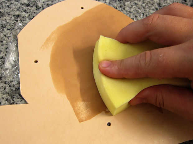 Utilice un trozo de lana de oveja o una esponja para aplicar agua a la piel. Esto se llama "cubierta". Se puede sumergir cuero en agua o puede utilizar una esponja si su proyecto es pequeño. Aplicar algunas capas de agua y luego dejar el cuero a un lado durante 30 minutos o más hasta que se devuelve el color original pero es frío al tacto que indica que todavía hay humedad en el interior. En esta etapa el cuero es para herramientas.