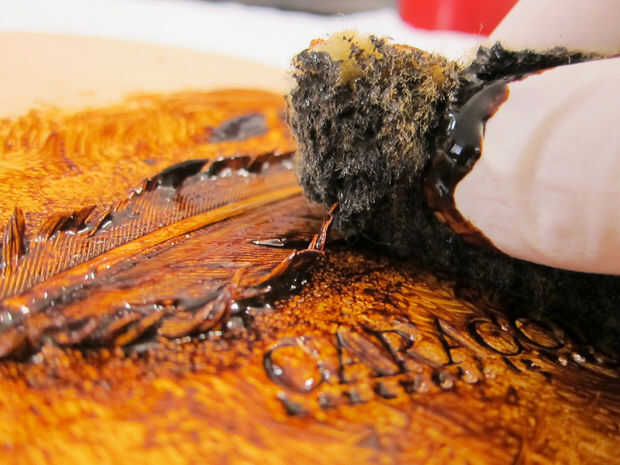 Obtener algunos antiguos sobre un trozo de esponja o lana de oveja y empezar con la pluma. Asegúrese de que obtener suficiente antigüedad debajo de los bordes por lo que no faltantes puntos. Luego aplicar el color a toda la superficie, trabajo bien en círculos.