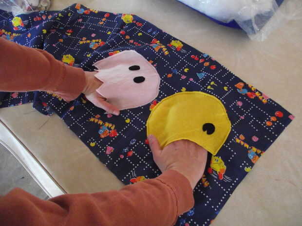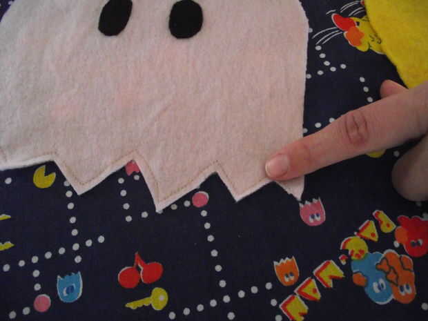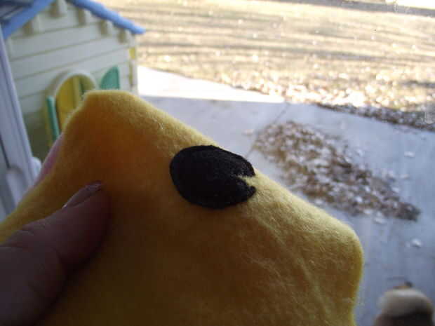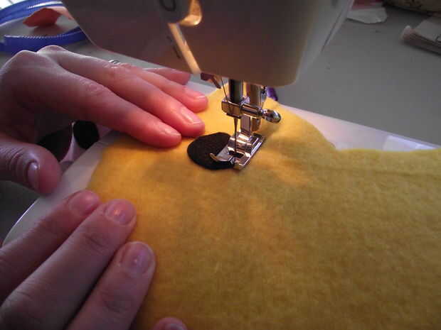Así que la próxima cosí sobre cada ojo poco muy lentamente. Porque soy un novato cuando se trata de una costura para que mi lema es lento y constante! Después de que cada uno tenía los ojos conectados y cualquier exceso fieltro fue recortado lo fue tiempo para coser encima del (como dice mi amigo) las partes flappy. La apertura de la manopla, para que nada batallas. Ahora es el momento para fijar esa manopla a la tela. Colocar en el centro o donde desea y perno a la derecha de una sola pieza de la tela, tipo de Entonces tome a su máquina de coser y coser alrededor del borde de su manopla, asegúrese de no coser la abertura. Y ahora tienes manoplas! Solo tienes que coser una almohada ahora. Casi allí, usted puede hacerlo!