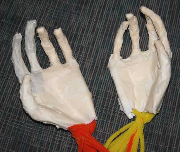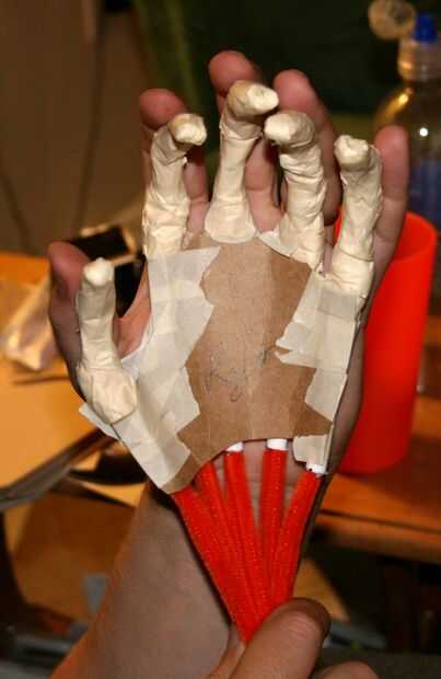 Con su marco, empezar por el dedo índice a lo largo de la línea que dibujó, con el fin de la charnela de descanso justo en el borde de la cartulina se establecen. No te preocupes si has rellenado hasta que el nudillo y no mentira planas. No somos mucho de un perfeccionista (como probablemente puede decir). Se aplican dos franjas horizontales de cinta adhesiva para sostener el hueso en su posición. Hacia el dedo medio y lo mismo. Repita para todos los dedos hasta que tenemos el dedo pulgar.