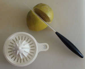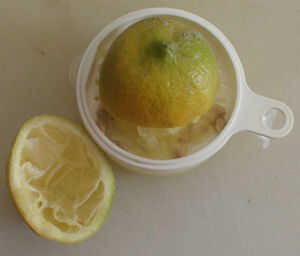 Cortar el limón por la mitad y lo jugo, está bien si las semillas caen en el jugo.