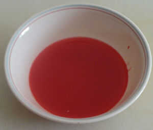 Agregue el colorante rojo con uno de los palillos hasta que es distribuida uniformemente a lo largo del jugo de limón.