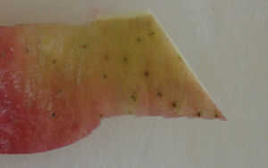 Empieza por tomar la piel deja reposar y corta el extremo en un ángulo como la primera foto.