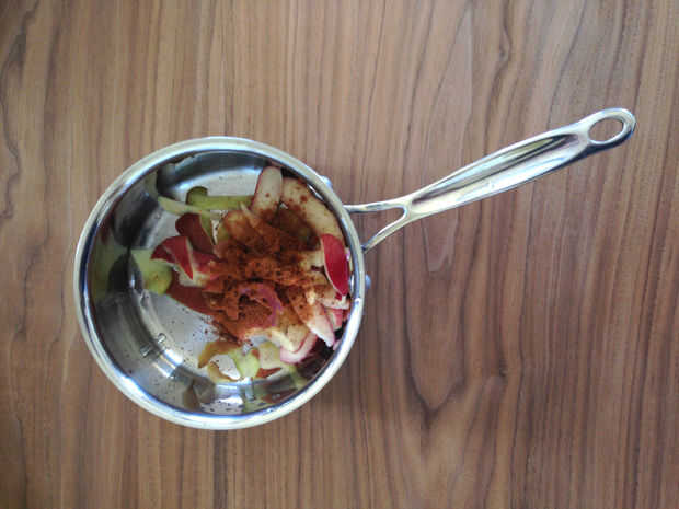 Pelar la piel en la sartén y apartar las manzanas. Añadir las especias. Voy en la canela y la luz en la nuez moscada y clavo de olor, pero esto es muy duro a mal y hasta sus preferencias personales.