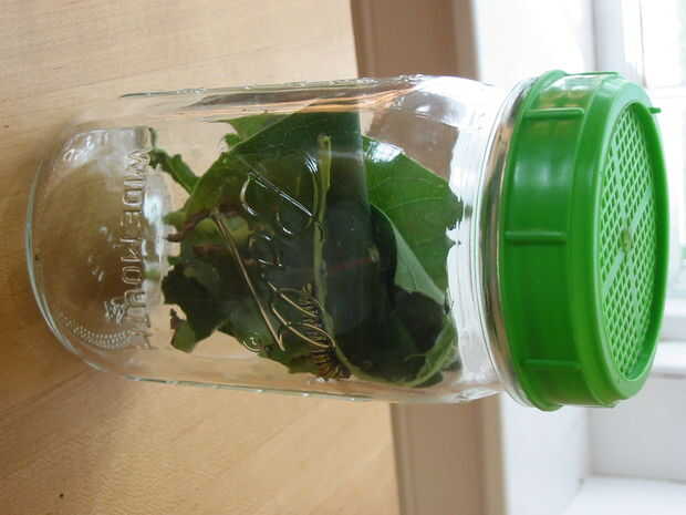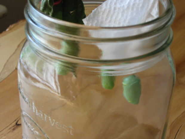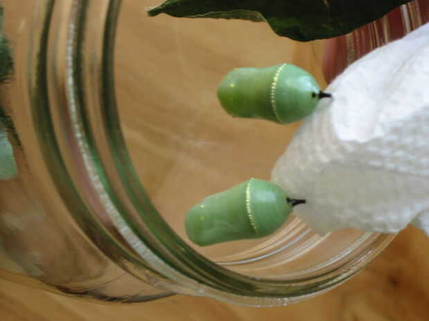 Una vez que se forma la crisálida, no hay nada que hacer sino esperar. Si tengo suerte, forman sus crisálidas en la toalla de papel que puse en la parte superior de la jarra. Esto rara vez sucede. En cualquier caso, yo generalmente transferirlos a un recinto net así que las puede volar un poco cuando nacen.
