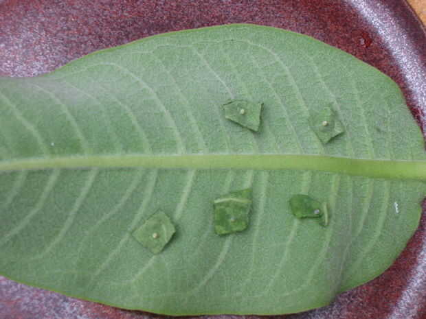 Esta técnica de transferencia de los huevos y orugas en las hojas frescas se utilizará a lo largo de todo el proceso. Es mucho mejor (las orugas) que tratar de deslizar un cuchillo debajo de ellos o si no desalojarlos de una hoja seca para pasarlos alimentos frescos.