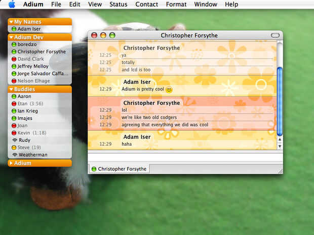Adium es una aplicación de mensajería gratuita hecha específicamente para Mac os x. Es no sólo compatible con Microsoft Messenger cuentas, pero también de AOL, Yahoo, ICQ, Google Talk, XMPP, Mobile Me, Bonjour, Myspace IM, Live Journal Talk, Facebook Chat, Lotus Sametime, Novell Groupwise, QQ, Gadu-gadu, y unos cuantos más que no aparecen en el sitio de Adium. Estoy seguro de que probablemente no vas a usar todos los, o incluso saber qué mitad de ellos son. Lo bueno de Adium es que todo es personalizable, desde la ventana de contactos, a los conjuntos de emoticonos, los estilos de ventana de mensaje, todo descargable gratuitamente en la web oficial de Adium. Por desgracia, no tiene funciones de webcam.