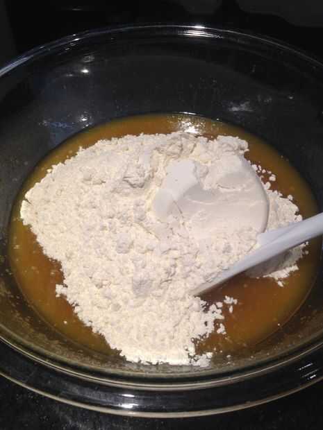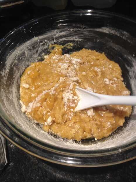 4. empieza con 2 tazas de harina, mezclar todo bien. Si parece un poco delicuescentes, añadir un poco más de harina.