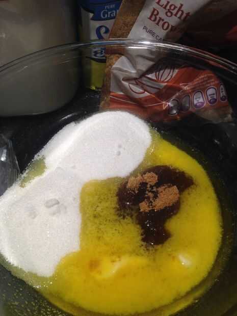 2. ablandar la mantequilla en un tazón, agregar el azúcar marrón y blanco y revolver bien.
