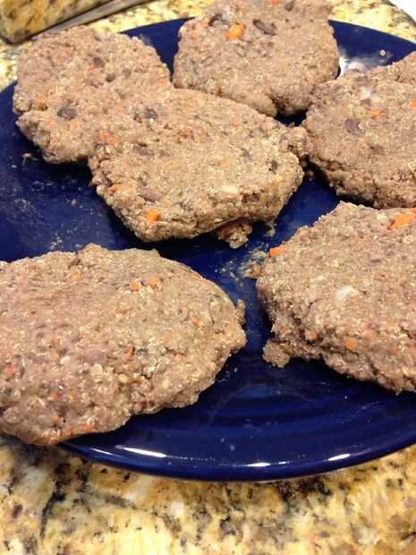 Raspar los ingredientes en la licuadora y en un recipiente de tamaño mediano y forma en 6 partidos. Calentar el aceite en una sartén y cocinar las hamburguesas hasta que estén ligeramente dorados en cada lado