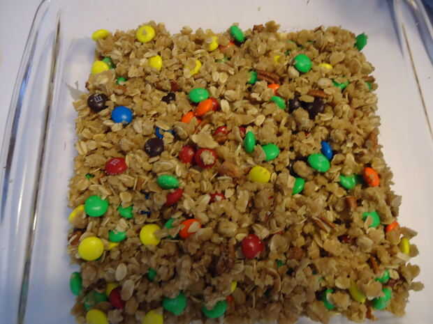Mezcla restante 6 cucharadas de harina con relleno de caramelo; Vierta sobre la parte superior. Combinar la mezcla de miga restante, quedan 3/4 taza "M & M" semi-Sweet Chocolate Mini Bits de horneado y tuercas de 1/2 taza restante; Espolvorear sobre la capa de caramelo.