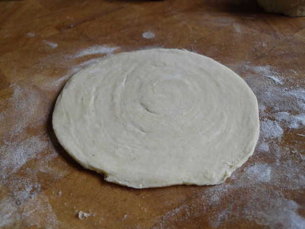 2. polvo de la superficie de trabajo con harina y, una sección de la masa a la vez, piezas del rodillo en un disco plano. (Nota: al rodar en un disco, asegúrese de que el centro del disco es más grueso que el perímetro--como no desea que el perímetro a ser "voluminosos" una vez que empiece a formar las mordeduras pastel de manzana).