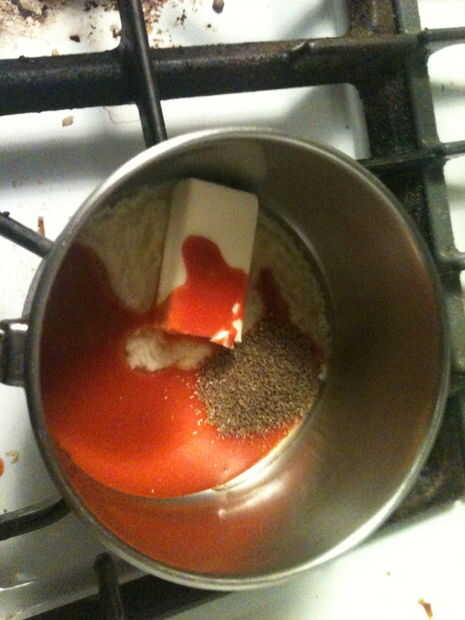 En una cacerola pequeña, derretir la manteca con salsa picante, semillas de apio y sal.