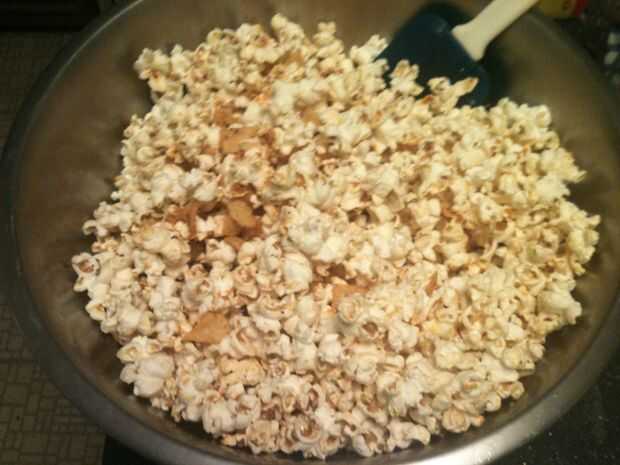 Verter sobre la mezcla de virutas de palomitas de maíz, sacudiendo suavemente a la capa.