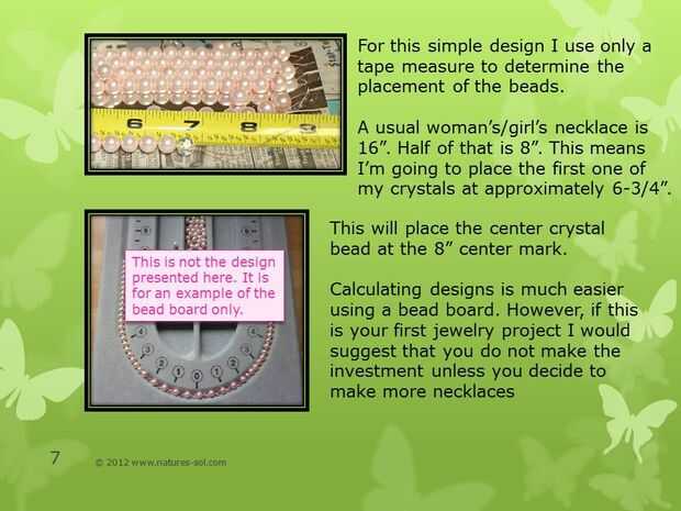 Si no utilizas cuentas de 6mm, entonces usted tendrá que hacer ajustes de tamaño. Recuerde que el centro del collar corto 16 pulgadas aterrizará en 8 pulgadas. El centro del collar largo 22 pulgadas será de aproximadamente 11 pulgadas.