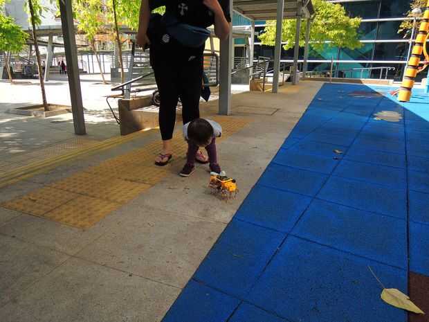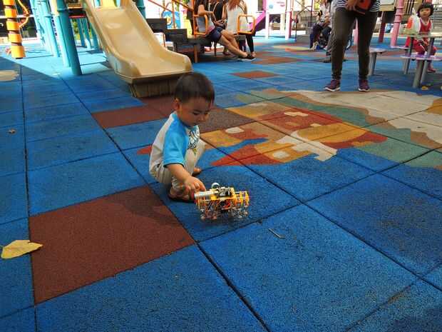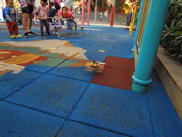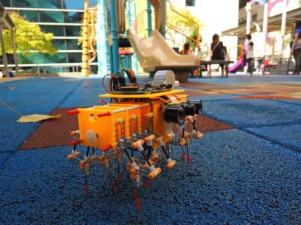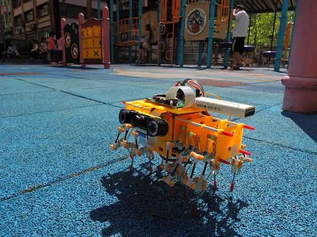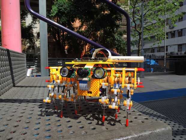 Algunas barras de aluminio + servos + Arduino = piernas de robot!Posible con el acoplamiento de las barillas servo accionamiento. Todo alimentado por baterías de NiMH.