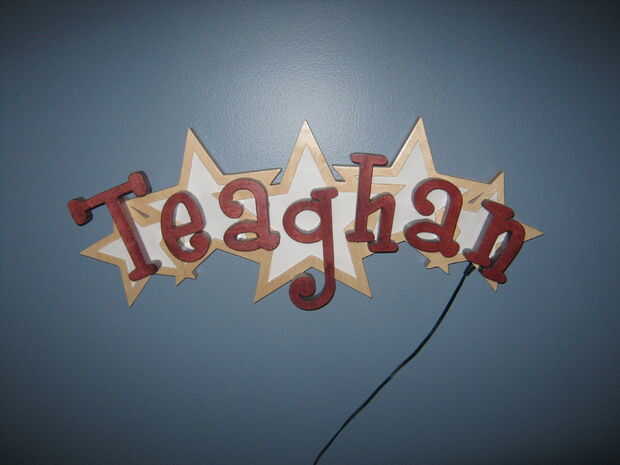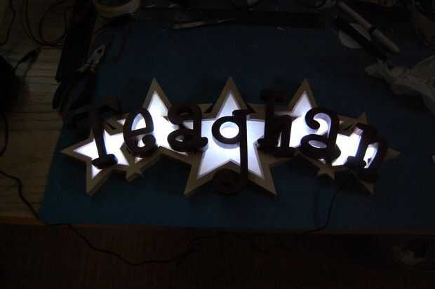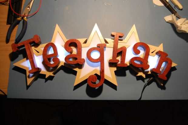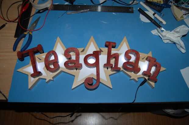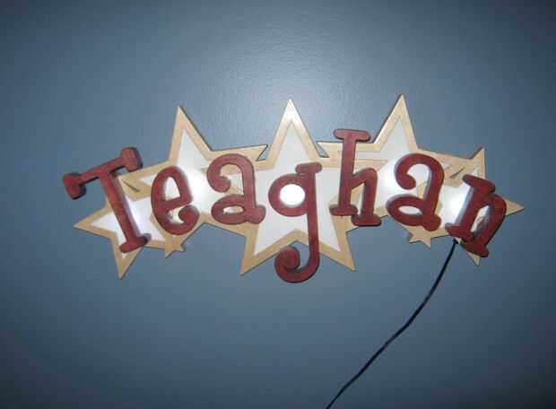 Este diseño es fácilmente modificado para casi cualquier nombre: simplemente corte letras diferentes y organizar en el mismo panel posterior. Por supuesto, también puede cambiar el color del LED y la madera el tinte/pintura un color diferente para que coincida con la habitación.
