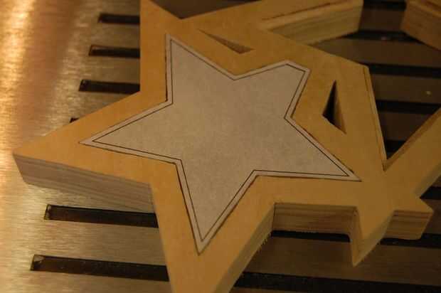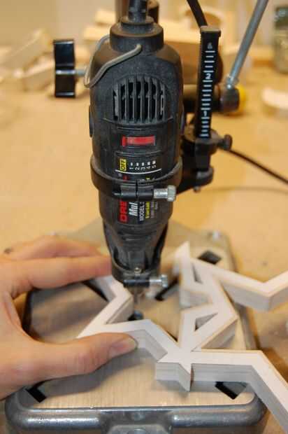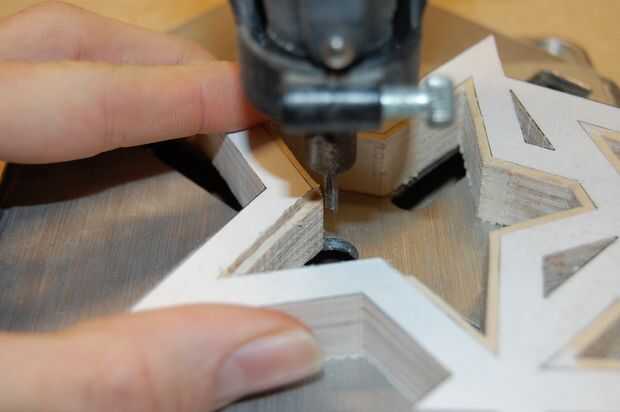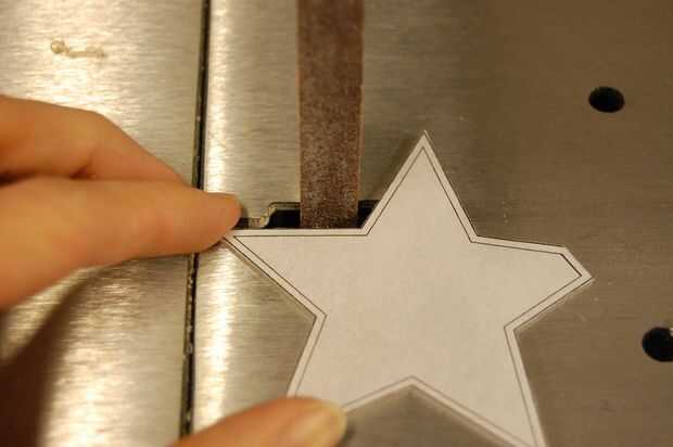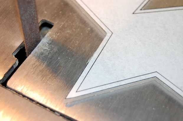 Cortar el borde, siguiendo el borde del patrón de papel. Usted tendrá que subir y bajar la dremel en el centro de cada estrella. Cuando el borde se ha reducido a 1/16" profundidad, hacer el corte a 1/8".