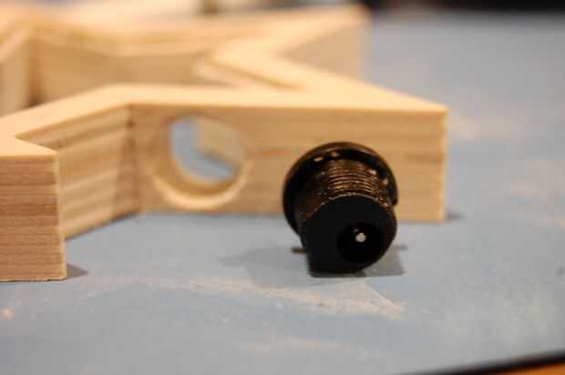 En este punto un agujero para la clavija de corriente debe taladrarse así. Para dar cabida a la 1/2" ancho toma utilicé, perforé un orificio de 1/2" en el borde inferior de la estrella de la derecha.