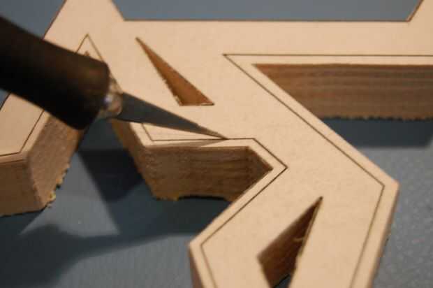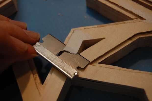 Para empezar, corta a lo largo de la línea que marca el borde con un cuchillo x-acto. No dude en cortar profundamente en la madera, sólo te ayudarán a obtener un borde limpio. Pele apagado la astilla fina de papel, pero deja el resto del patrón en la madera por ahora.