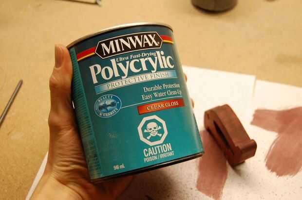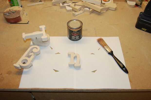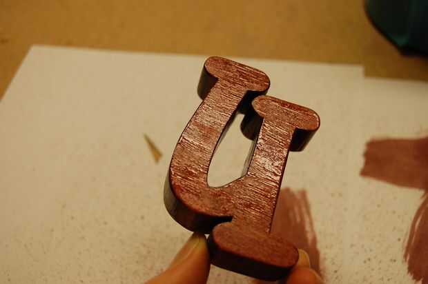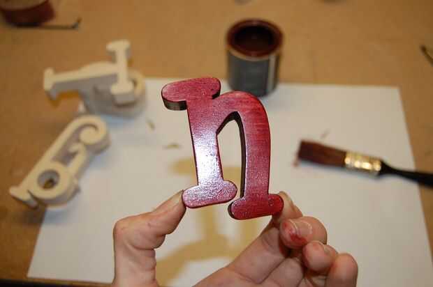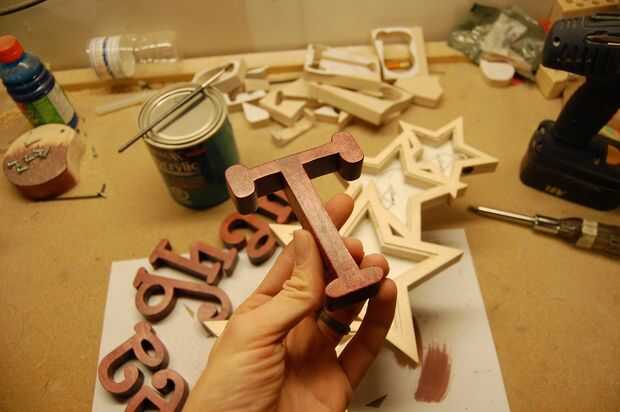 También pinté las letras y estrellas con dos capas de acabado. Minwax Polycrylic, para ser específicos. Se los recomiendo; da un bonito acabado brillante, es relativamente de bajo olor, y limpia con agua. Entre las capas de acabado, lije con lija de grano fino o raspar con un pequeño raspador gabinete.