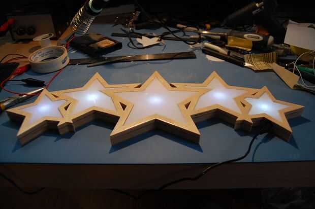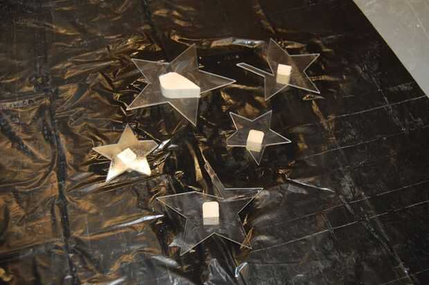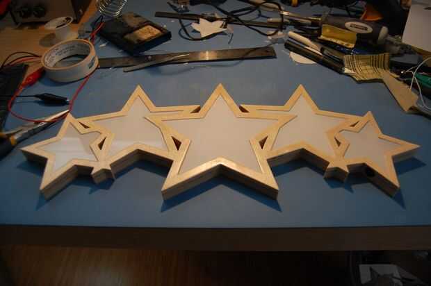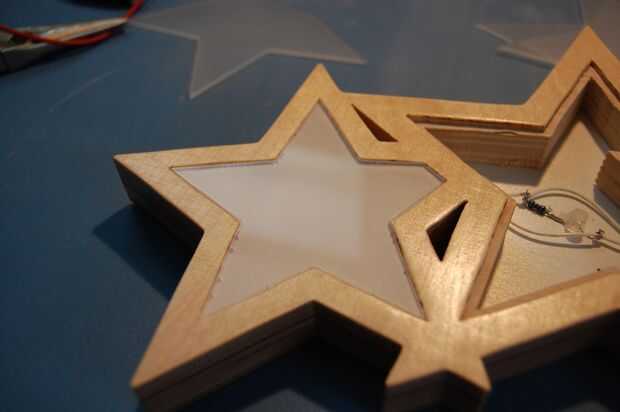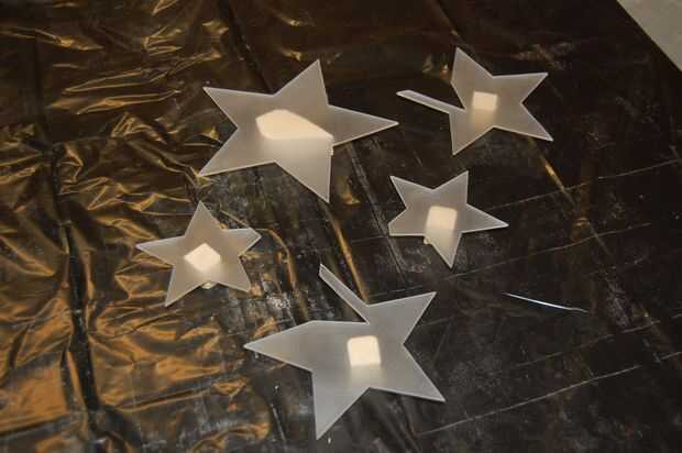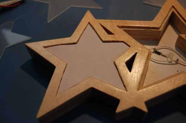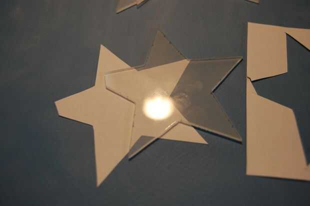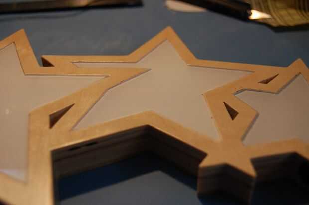 Con el glaseado y difusores de papel completa, todo puede montarse en el marco de la estrella. Pegue los difusores de papel en primer lugar, aplicar una fina capa de pegamento blanco a la cornisa y luego cuidadosamente colocando el papel en lugar. Pegamento en las incrustaciones de plástico, mediante la aplicación de pegamento en el borde de la repisa sólo y con cuidado colocar el plástico. Usar cola blanca o epoxy para esto; no importa que. No use demasiado - idealmente, el pegamento no debe ser visible y no se debe exprimir.