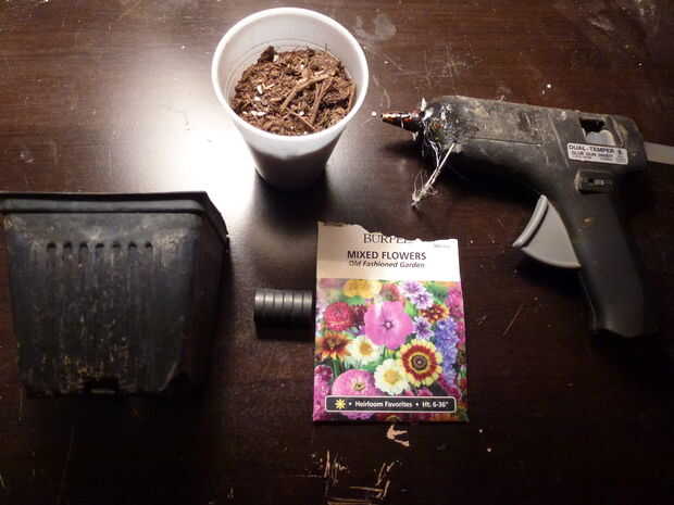 Antes de comenzar necesita reunir unos pocos materiales. Necesita 4-6 imanes circulares, una olla de 4", rellenado de tierra, semillas de flores y una pistola de pegamento caliente. Usted puede modificar el tamaño de la maceta pero recuerde: cuanto mayor sea la maceta, el más fuerte los imanes deben ser.