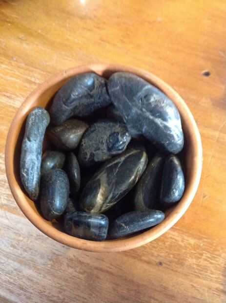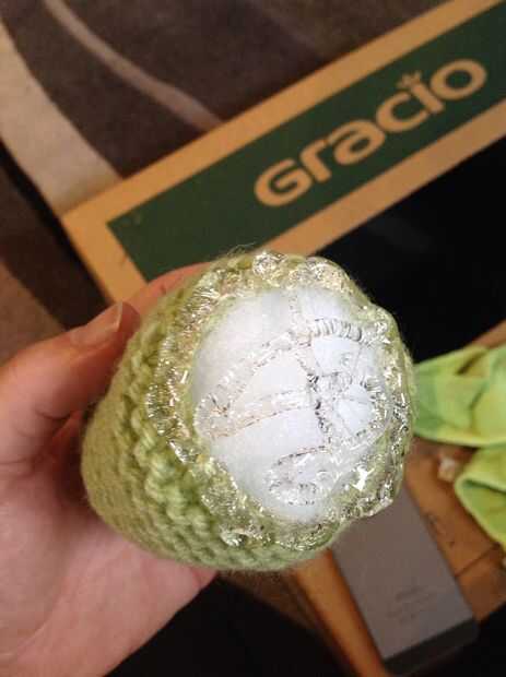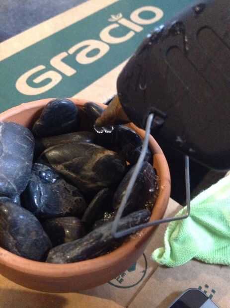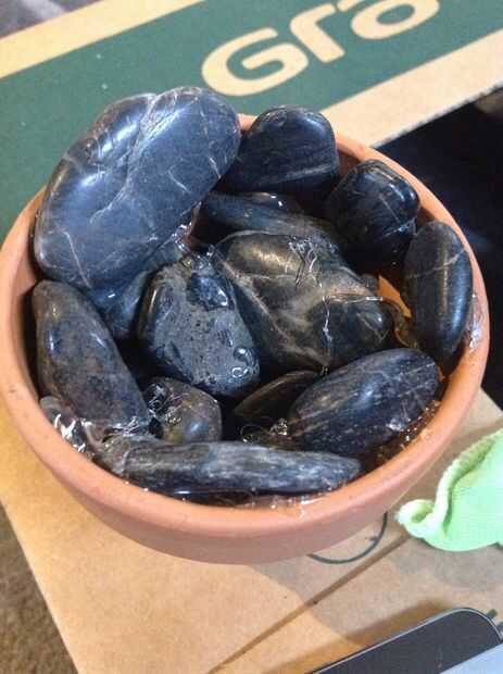 Pegar la fila superior de piedras en la olla usando pegamento caliente. Tenga cuidado con los dedos aquí.