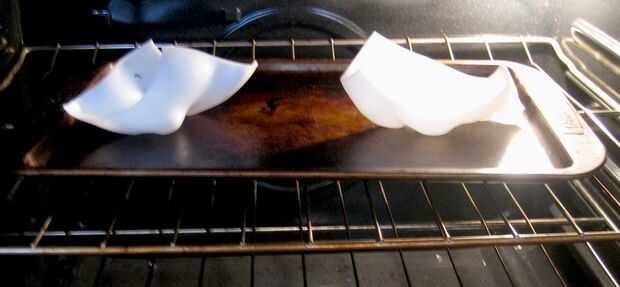 2. Coloque el plástico cortado en la charola y hornear por aproximadamente 3 minutos. A acurrucarse al horno pero se aplane completamente finalizado (Nota: a veces el plástico puede acurrucarse en formas extrañas y empiezan a pegarse a sí mismo. Si esto ocurre, retire la cacerola del horno y tire cuidadosamente las porciones pegadas aparte - es realmente caliente, así que ten cuidado!)