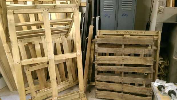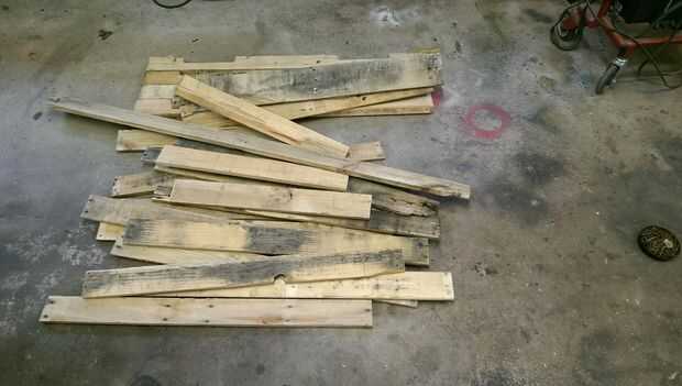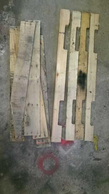 Para este proyecto necesitarás al menos 3 palets, los listones más por la plataforma mejor. Trate de encontrar plataformas con barandas buena (~ 2 x 4) y también tratar de encontrar al menos 4 sobre listones de tamaño (5" a 6" ancho - por lo general en los extremos de las plataformas). Desmontar los palets, teniendo en cuenta que usted no necesita toda la longitud de los listones para que puedas hacer algunos comprende si necesario.