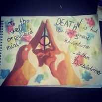 Así que esto era algo que hice porque recientemente conseguí en pintura otra vez. Pensé que las reliquias de la muerte sería una cosa agradable de tema Harry Potter para dibujar debido al significado detrás de él, pero overthought, como lo hace y decidió que la muerte no es algo que debe ser oculta, es algo que debe ser abrazado y luchó porque todo el mundo tiene el derecho a vivir sus vidas lo que quieren. Esa es la razón por la substituyó la capa de invisibilidad con dos dedos del medio, como una F final a muerte supongo, misma razón elegí esa cita.