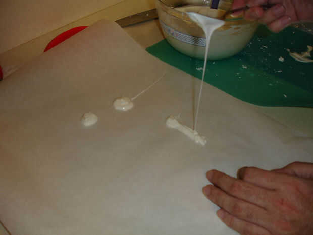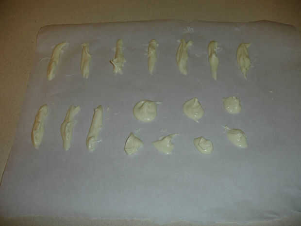 Coloque una hoja de papel de pergamino en el mostrador. Ahora, con una caída de la cuchara una pequeña cantidad de chocolate blanco. Vierta en una línea delgada que va hacia adelante y hacia atrás la longitud de los dedos de su molde. No te preocupes demasiado si se propaga hacia fuera, usted puede siempre recorte el exceso más tarde. Repita esto para todos los cinco dedos. (10 dedos si es para ambas manos).
