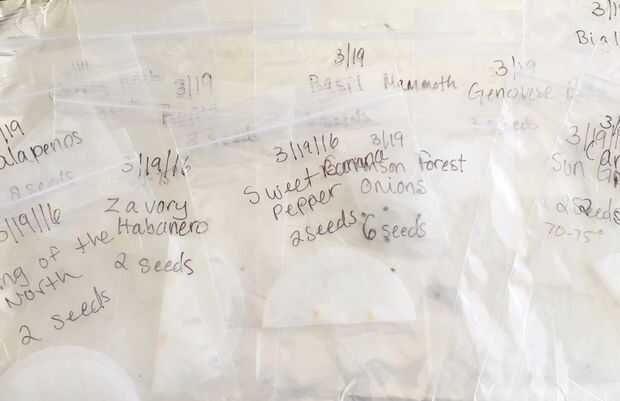 Coloque sus semillas en sus respectivas bolsitas y presione suavemente el aire hacia fuera. Ahora algunos dicen presionar el aire de la bolsa y luego sellarla. Algunas personas dicen no sellarlo. Otros dicen sellarlo, pero no presione el aire hacia fuera. Lo he intentado todos estos y no noté una diferencia. Creo que lo que hace la mayor diferencia en el proceso de la germinación es configurar tus semillas y germinación a la temperatura adecuada. Tomates que necesitan 80 grados para germinar no va a si la temperatura es de 70.