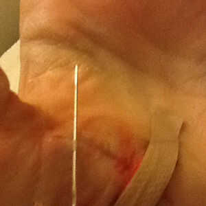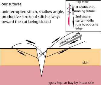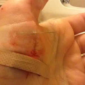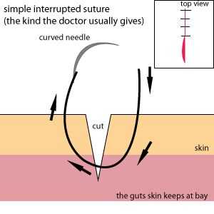 ¿Nunca ha cosido para arriba por un profesional médico? Generalmente toma una aguja curvada, ejecutarlo desde el exterior a través de toda la capa de la piel, después a través de la laceración por otro lado, parte inferior hacia arriba y hacia fuera. Entonces ate cada puntada con un nudo cuadrado. Esto se llama una sutura simple interrumpida. El beneficio de este tipo de sutura es su fuerza (ya que está anclado a ambos lados en toda la capa de piel, que es bastante gruesa) y su independencia de otras suturas. Sutura de una falla, el resto permanecerá en sus lugares para mantener unida a la herida. No pasó mucho tiempo para realizar que este método no iba a trabajar en mi situación. El primer obstáculo era mi aguja recta. Una vez que lo conseguí a través de mi piel, era tipo de un callejón sin salida. Da vuelta la esquina para cruzar la herida requiere un montón de tensión en una parte ya lesionada de mi cuerpo y también consiguió a sangrar otra vez. Agrava el problema fue el hecho de que la laceración ser cosida estaba en mi mano. Esto significa que sólo tenía una mano para usar, y su trabajo fue la costura. Cuando intenté volver a subir por el otro lado, mi piel proporciona suficiente resistencia a la aguja que sólo empujó a la piel y el corte abierto todo en vez de piercing muy bien la piel por lo que pude completar la puntada. Terminé de sostener la piel en el lugar con 2 dedos y empujar la aguja throughwith mi pulgar. Francamente, después de un paso de esta manera, me sentí un poco como repartiendo. Bueno, tal vez más que un poco. Así que modifiqué la puntada y el resto fue la torta (en comparación con la primera puntada, por lo menos).