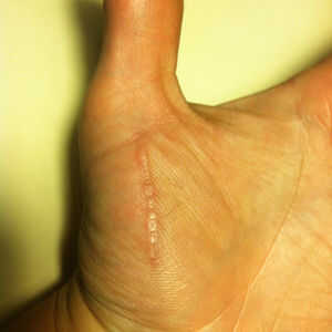 Esta es mi mano la curación. La cicatriz se pegue, pero simplemente considero que es un recordatorio para tener cuidado con objetos afilados.