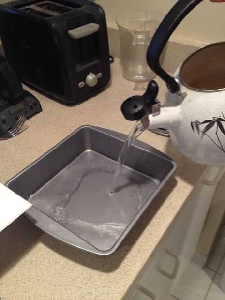 Calentar agua (sea cual sea su preferencia). Se utilizó una tetera y deje que el agua se sientan por lo que no estaba hirviendo. Desea el agua caliente pero no caliente; caliente lo suficiente como para permitir la impresión liberar no se despegan. Luego Vierta el agua en un plato profundo cerca de 3 pulgadas hará, dependiendo del tamaño de su plato.