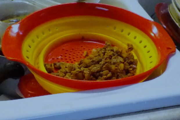 Drenar el exceso de aceite y la grasa de la sartén usando un colador y volver a poner la carne en la sartén.
