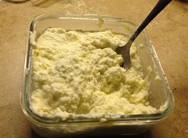 En un recipiente aparte, mezclar el queso ricotta, queso parmesano y los huevos.