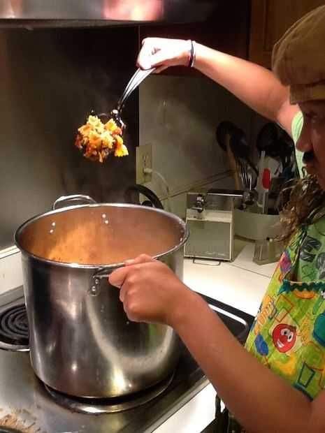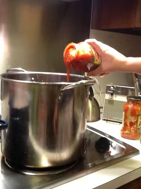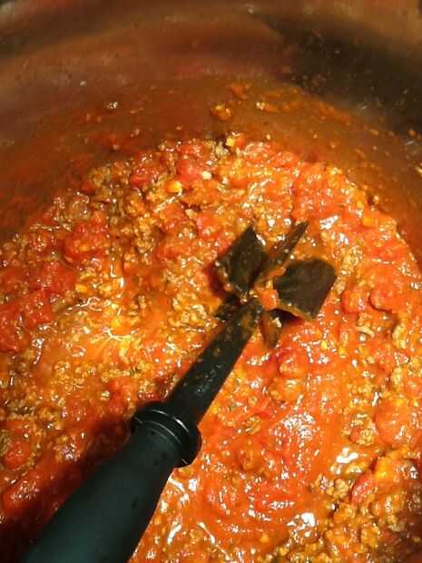 Poner la carne, la pasta, los tomates y la salsa de todos juntos en una olla y revuelva para arriba.