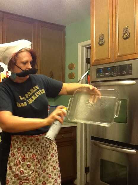 Go ahead y precaliente horno a 400 grados en este momento. Rocíe el pan con algunos cocinar. Se arrepentirá más tarde, cuando tenga que lavar, si no lo hace. Cucharada de la pasta en la sartén y lo extendió.