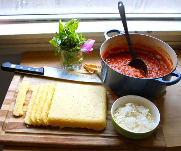Hice mi salsa de tomate desde cero - encontrar cómo hacerlo aquí o aquí! Es mejor que una salsa realmente gruesa y sabrosa con la polenta. Mina incluye alcaparras, cebollas, ajo, apio y zanahorias!